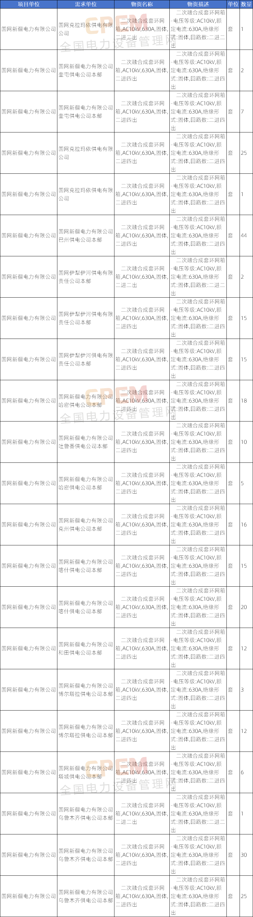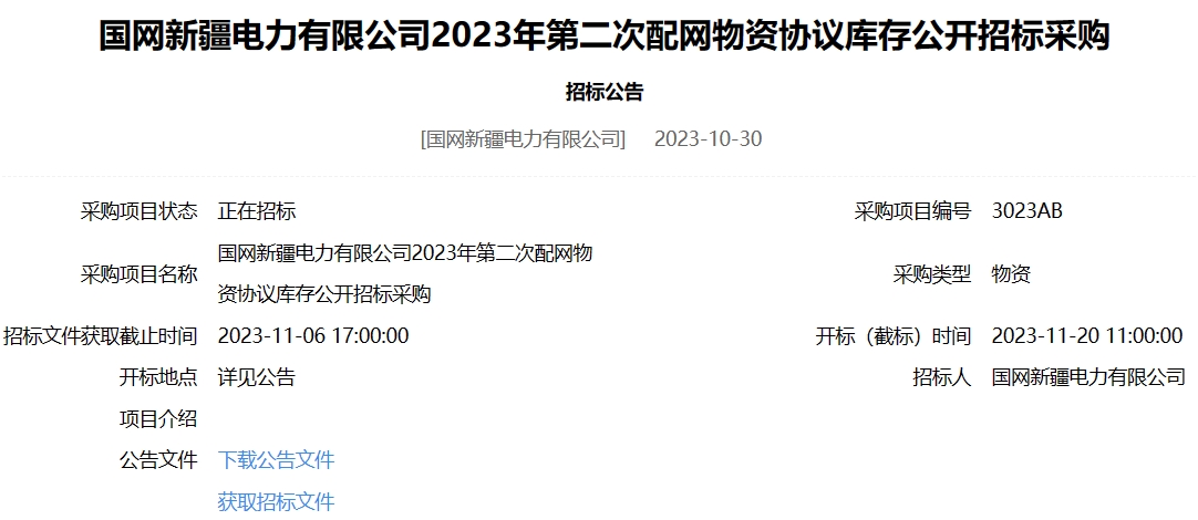 10月30日,国网新疆电力有限公司发布“2023年第二次配网物资协议库存公开招标采购”的招标公告。