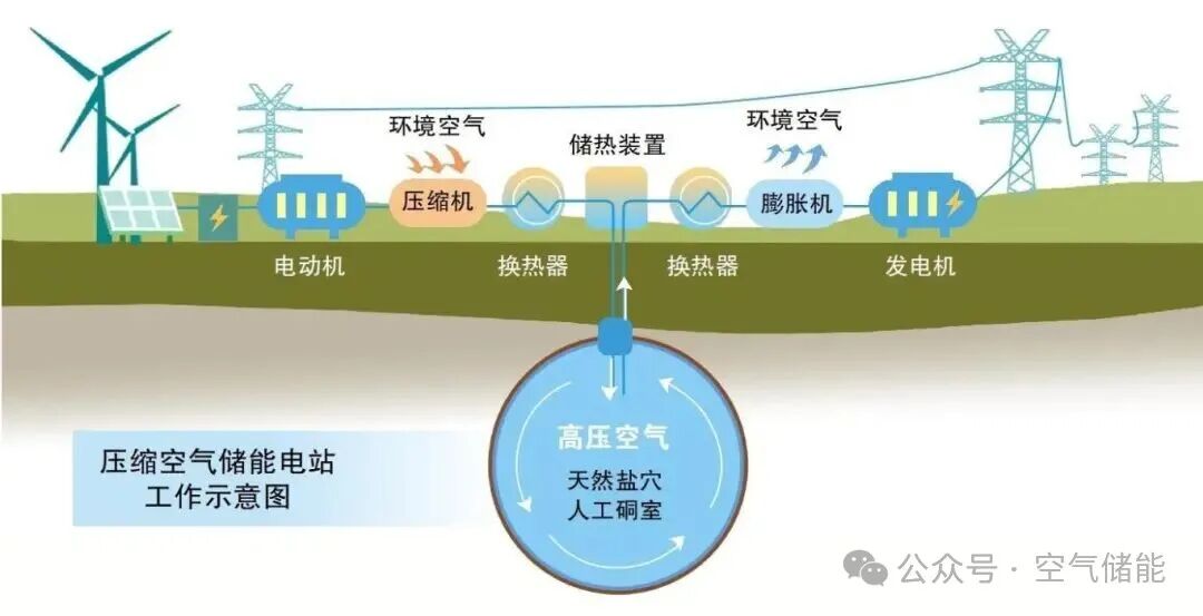 压缩伟德体育怎么注册的工作原理是利用用电低谷期的电能通过压缩机压缩空气,把电能转换成空气压力能和一部分热能储存到储气库中,实现能量的存储;在用电高峰期,从储气库中释放出的高压空气经加热升温后通过膨胀机做功,转化为机械能,进而带动发电机发电,实现能量的释放。