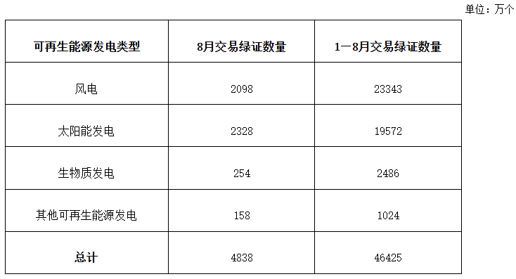 2025年8月,全国交易绿证4838万个,其中绿色电力交易绿证1763万个。2025年1—8月,全国交易绿证4.64亿个,其中绿色电力交易绿证1.58亿个。