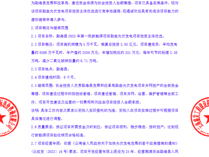 9月23日,勐海县2025年第一批新能源项目勐翁光伏发电项目投资主体优选竞争性磋商公告,公告显示,项目装机规模为5万千瓦,概算总投资2.05亿元。项目建成后,年均发电量约8500万千瓦时,年产值约2550万元,年增加税收约331万元,每年可节约标煤2.58万吨,减少二氧化碳排放量约6.71万吨。