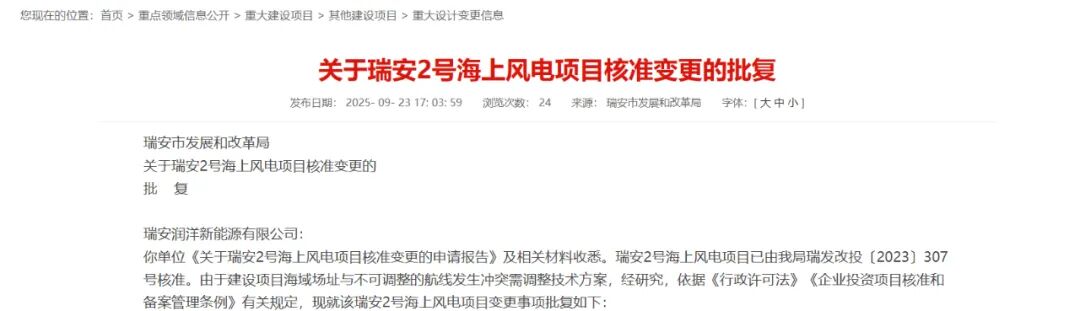 近日,瑞安市发展和改革局发布《关于瑞安2号海上风电项目核准变更的批复》。