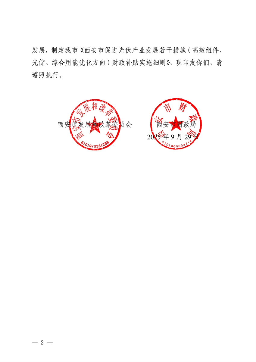 西安市发展和改革委员会 西安市财政局《西安市促进光伏产业发展若干措施(高效组件、光储、综合用能优化方向)财政补贴实施细则》已印发,请相关能源企业认真结合要求,积极筹备相应资料,与发展改革局对接,待后期市发改委申报通知下达后,我局将依规组织申报。