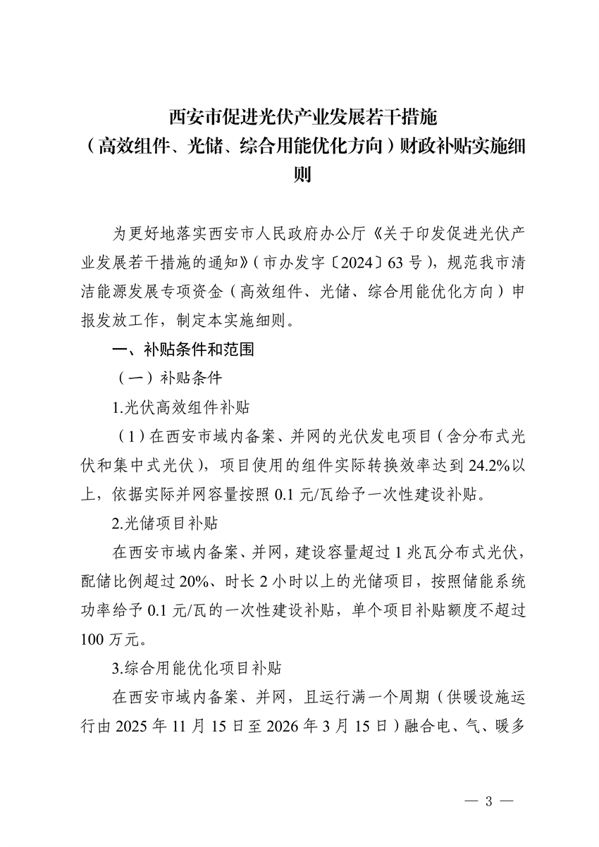 10月21日,陕西省西安高新区发展改革局发布关于转发《西安市促进光伏产业发展若干措施(高效组件、光储、综合用能优化方向)财政补贴实施细则》的通知。