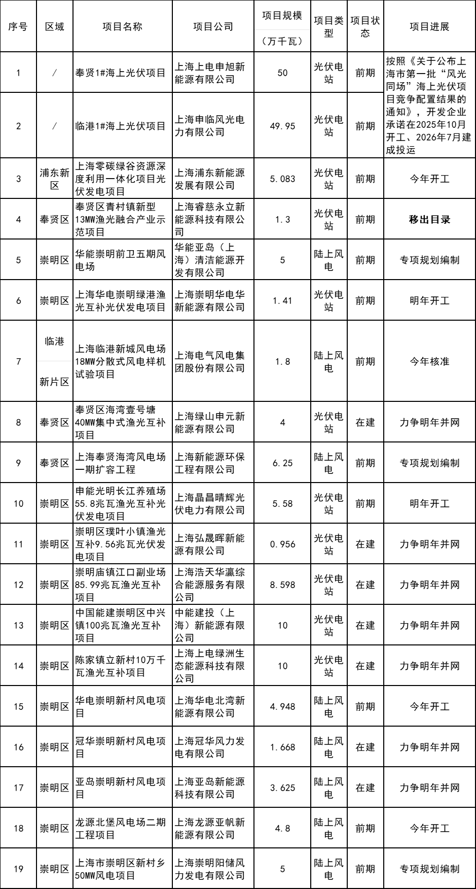 已纳入上海市2025年陆上风电和光伏电站开发建设方案项目进展