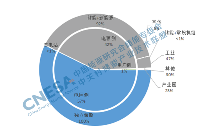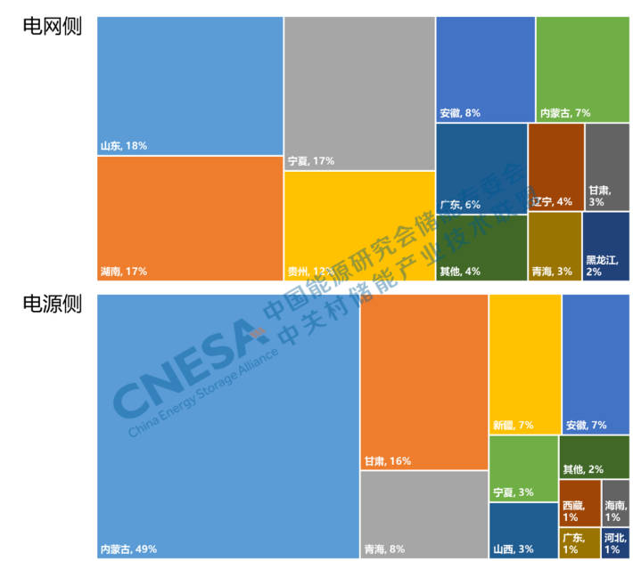 电网侧规模占比57%,与5月份相比降低了16个百分点。从应用分布上看,电网侧功率规模与5月份相当,规模为8.4GW/17.9GWh,但规模占比与5月相比有所下降,降幅达16%,以独立储能为主,这些项目主要分布在山东、湖南、宁夏等省份,20余项百兆瓦级电网侧独立储能项目在6月底集中投运。电源侧功率规模环比增长111%,规模达6.2GW/13.4GWh,占比较5月增加了16个百分点,以新能源配储为主,主要分布在内蒙古、甘肃、青海等省份,其中内蒙古、甘肃均规划了GWh级新能源配储项目。