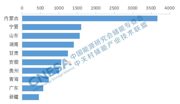 图 1:6月份新型储能项目功率规模排名前十的省份(单位:MW)