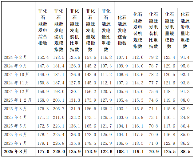 2025年8月,全国非化石能源发电综合指数为177.0,比2020年基期(以2020年基期为100)增长了77.0%,同比增长16.1%;其中,新能源发电综合指数为282.3,比2020年基期增长了182.3%,同比增长30.8%。在“双碳”目标引领下,非化石能源及其新能源发电综合指数保持快速增长态势。其中: