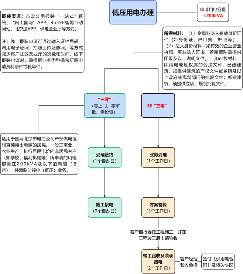针对符合“三零”服务范围的企业低压电力接入工程,无需办理任何行政许可手续,由国网北京市电力公司统一负责建设。