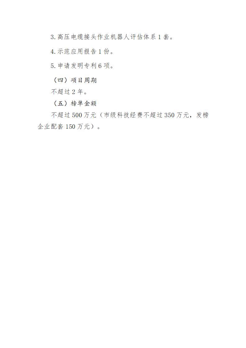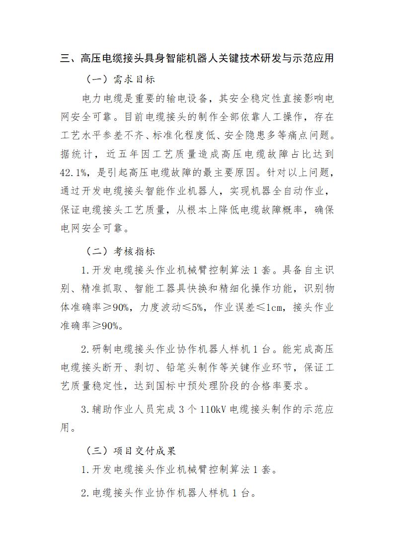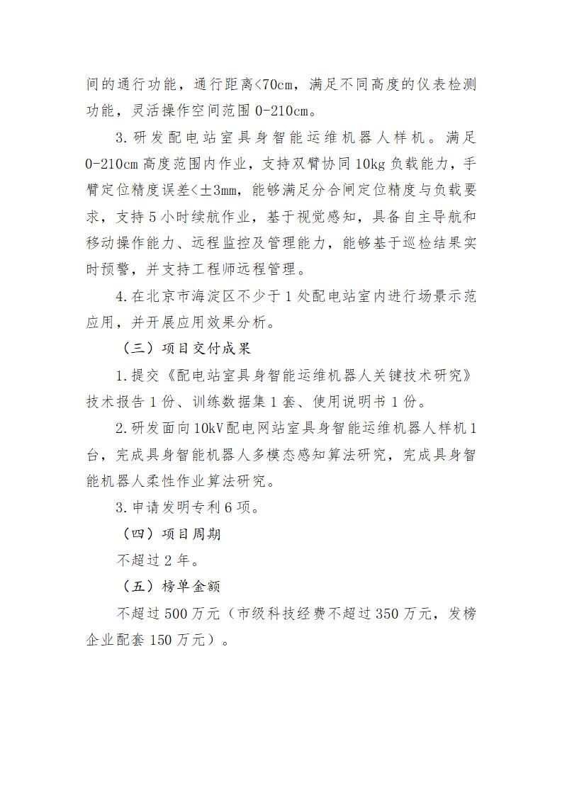 榜单中包括配电站室运维具身智能机器人关键技术研发与示范应用、变电站巡检具身智能机器人关键技术研发与示范应用、高压电缆接头具身智能机器人关键技术研发与示范应用。三个项目榜单金额均不超过500万元(市级科技经费不超过350万元,发榜企业配套150万元)。