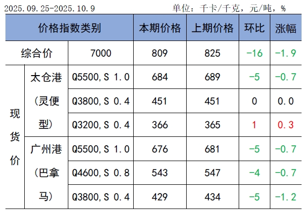 CECI曹妃甸指数5500千卡/千克、5000千卡/千克和4500千卡/千克平均价格分别为705.2元/吨、614元/吨和539元/吨,分别比上期平均价格下降0.6元/吨、1.6元/吨和5.6元/吨。从样本情况看,本期曹妃甸指数日均现货交易数量较上期小幅增加,其中5500千卡/千克样本数量略有减少,5000千卡/千克、4500千卡/千克样本数量略有增加。