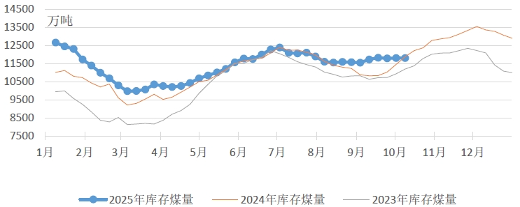 燃煤电厂生产方面,上周特殊的天气模式使煤炭日耗表现出较强的韧性。尽管处于国庆长假工业活动减弱的时期,但南北方因天气造成的用电需求形成互补,使得整体日耗并未出现传统断崖式下跌。电厂发电量和耗煤量环比基本持平。根据中电联电力行业燃料统计数据,本周(10月3日至10月9日,下同),纳入统计的燃煤发电企业日均发电量环比(9月26日至10月2日,下同)减少0.3%;日均耗煤量环比增长0.8%,同比减少8.8%。其中海路运输电厂日均发电量环比减少3.4%,同比增长22.6%。电厂库存量环比基本持平,截至10月9日电厂存煤11816万吨,较10月2日增长4万吨;电厂库存可用天数27天,较10月2日增长0.8天。
