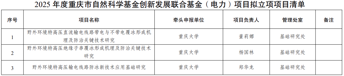 其中电力项目有3项,均由重庆大学牵头申报,分别是野外环境特高压直流输电线路带电与不带电覆冰形成机理及防治关键技术研究、野外环境特高压绝缘子串覆冰形成机理及防治关键技术研究、野外环境特高压输电线路防冰新技术应用基础研究。