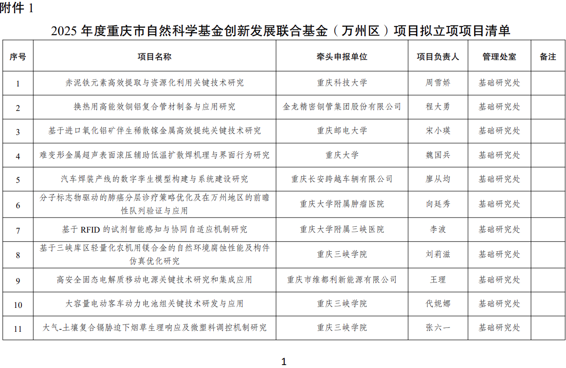 10月10日,2025年度重庆市自然科学基金创新发展联合基金(万州区、气象、电力)项目拟立项项目公示。