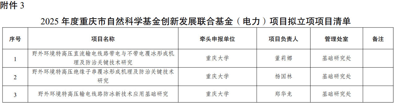 3.2025年度重庆市自然科学基金创新发展联合基金(电力)项目拟立项项目清单