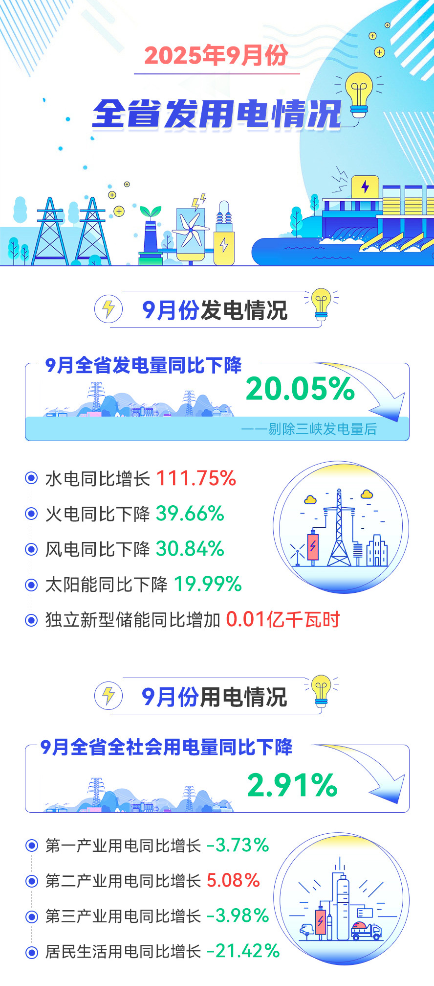9月湖北省全社会用电量同比下降2.91%,9月全省发电量同比下降20.05%。