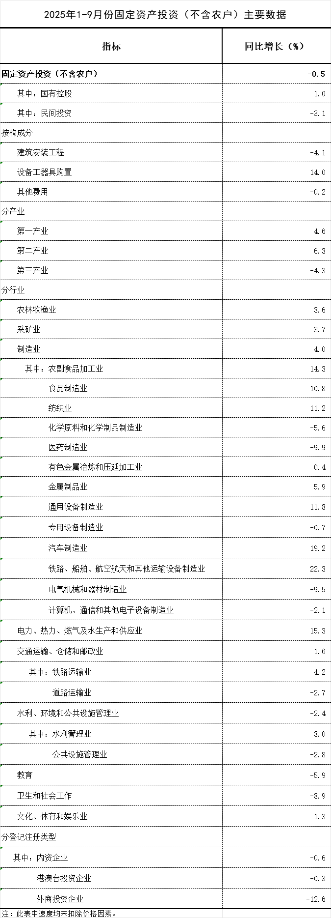 2025年1—9月份,全国固定资产投资(不含农户)371535亿元,同比下降0.5%(按可比口径计算,详见附注7)。其中,民间固定资产投资同比下降3.1%。从环比看,9月份固定资产投资(不含农户)下降0.07%。