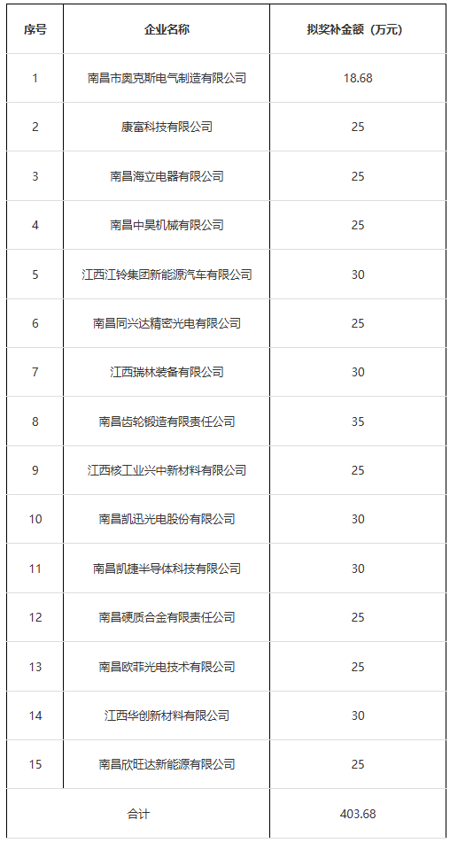 此次公示涉及15家企业,拟补奖金额403.68万元。详情如下: