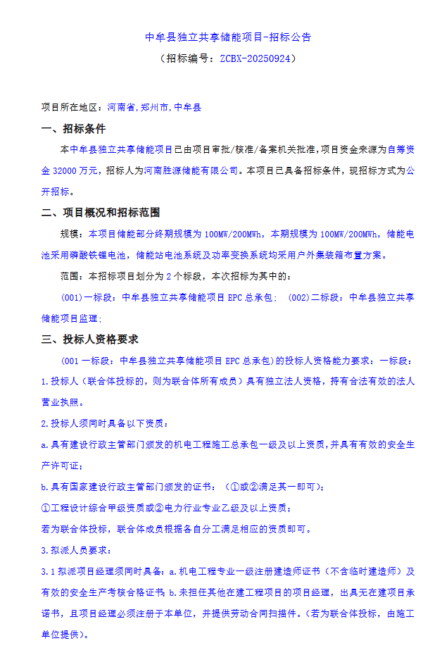 9月26日,河南胜源储能有限公司发布中牟县独立共享储能项目招标公告。项目位于河南省郑州市中牟县,本项目储能部分终期规模为100MW/200MWh,本期规模为100MW/200MWh,储能电池采用磷酸铁锂电池,储能站电池系统及功率变换系统均采用户外集装箱布置方案。范围:本招标项目划分为2个标段,本次招标为其中的: