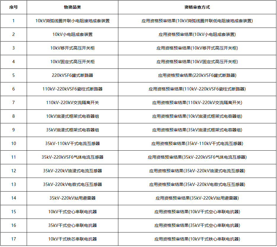 批次框架招标范围包括10kV消弧线圈并联小电阻接地成套装置、10kV小电阻成套装置、10kV移开式高压开关柜、10kV固定式高压开关柜、220kVSF6罐式断路器、110kV-220kVSF6瓷柱式断路器、110kV-220kV交流隔离开关、10kV油浸式框架式电容器组、35kV油浸式框架式电容器组、35kV-110kV干式电流互感器、35kV-220kVSF6气体电流互感器、35kV-220kV油浸式电流互感器、35kV-220kV电容式电压互感器、35kV-220kV站用避雷器、10kV干式空心串联电抗器、35kV干式空心串联电抗器、10kV干式铁芯串联电抗器等17个物资品类。