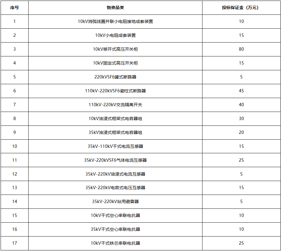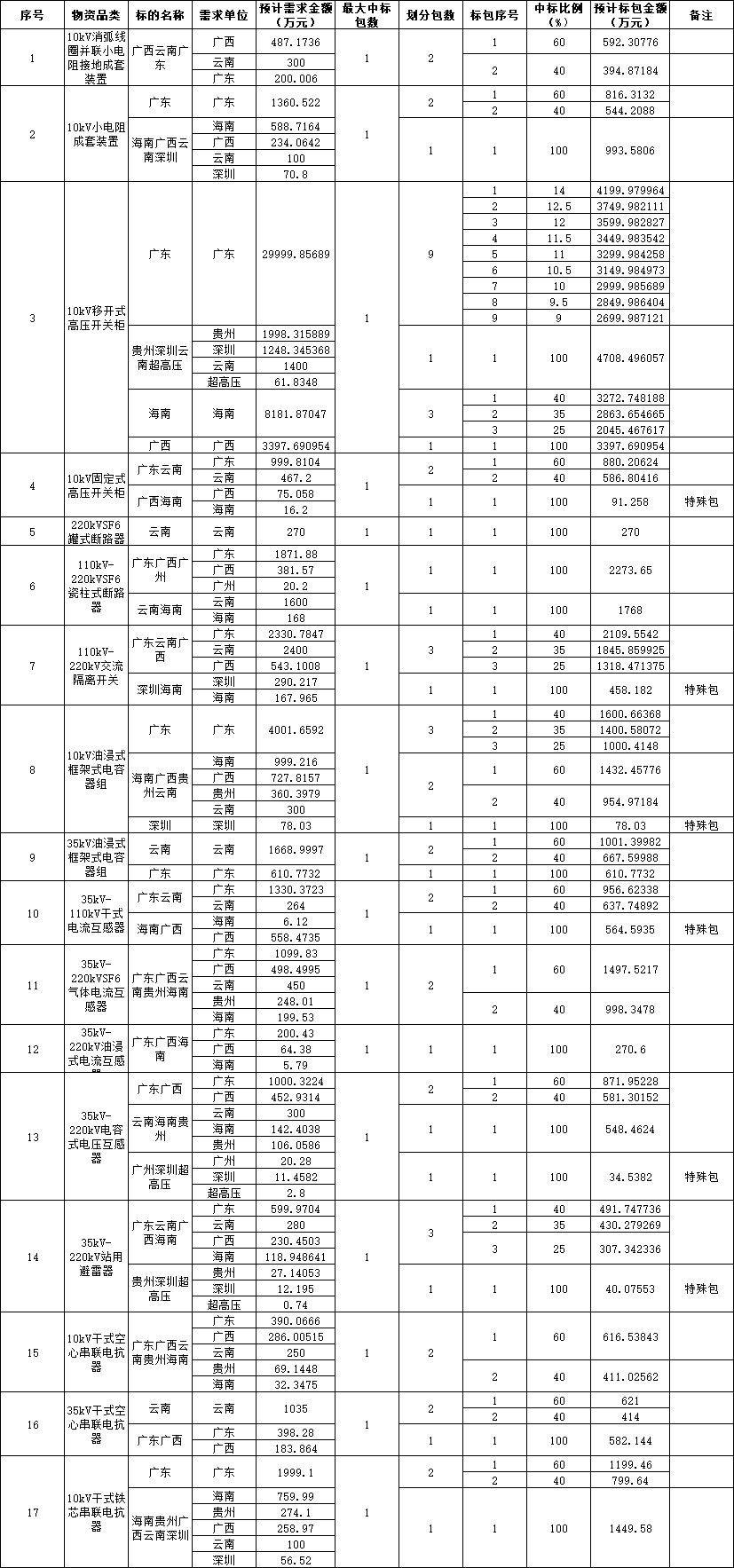 按公司2025年集团物资集中采购工作计划,超高压公司、广东、广西、云南、贵州、海南电网公司和深圳供电局7家单位上报了10kV消弧线圈并联小电阻接地成套装置、10kV小电阻成套装置、10kV移开式高压开关柜、10kV固定式高压开关柜、220kVSF6罐式断路器、110kV-220kVSF6瓷柱式断路器、110kV-220kV交流隔离开关、10kV油浸式框架式电容器组、35kV油浸式框架式电容器组、35kV-110kV干式电流互感器、35kV-220kVSF6气体电流互感器、35kV-220kV油浸式电流互感器、35kV-220kV电容式电压互感器、35kV-220kV站用避雷器、10kV干式空心串联电抗器、35kV干式空心串联电抗器、10kV干式铁芯串联电抗器等17个物资品类的需求,根据年度采购计划组织开展本批次的框架招标工作。