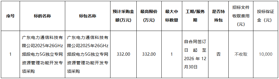 为满足广东电力通信科技有限公司2025年5G毫米波通信项目开展需要,需进行广东电力通信科技有限公司2025年26GHz频段电力5G独立专网资源管理功能开发专项采购,最高限价332万元。