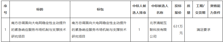 南方总调面向大电网稳定性主动提升的紧急响应服务市场机制与支撑技术研究项目中标候选人公示