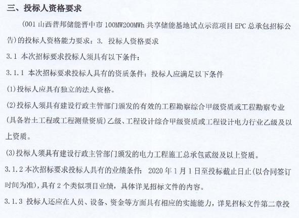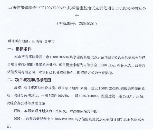 3月7日,山西普邦储能晋中市100MW200MWh共享储能基地试点示范项目EPC总承包招标公告发布。项目总占地约 50 亩,建设 100MW/200MWh 磷酸铁锂储能系统。项目分两期建设,一期50MW/100MWh,二期50MW/100MWh,配套建设一座220kV升压站,及综合办公楼等基础设施。