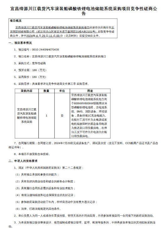 4月18日,宜昌缔源川江载货汽车滚装船磷酸铁锂电池储能系统采购项目竞争性磋商公告发布。