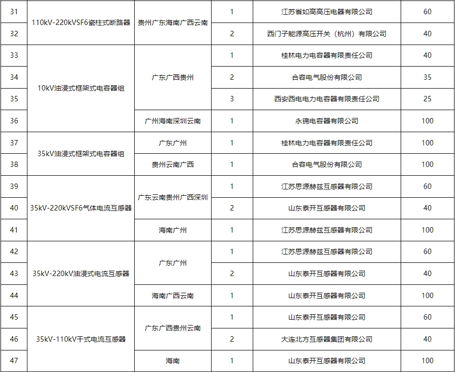 南方电网公司2024年主网一次设备第一批框架招标项目中标结果公告