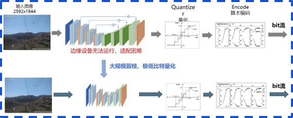 该技术采用边缘端压缩配合后端恢复方案,结合模型轻量化技术,结合剪枝、权值共享和量化等方式,降低模型参数量和尺寸,并通过算子适配,使模型适用于常规边缘端设备;压缩过程中将原始高质量图像、视频输入压缩模型,得到原图压缩后的高压缩比中间结果;后端恢复时利用训练完的网络模型参数将压缩模型输出的低质量、高压缩比的中间结果经过恢复模型的反向运算,输出相匹配的高质量图像、视频。