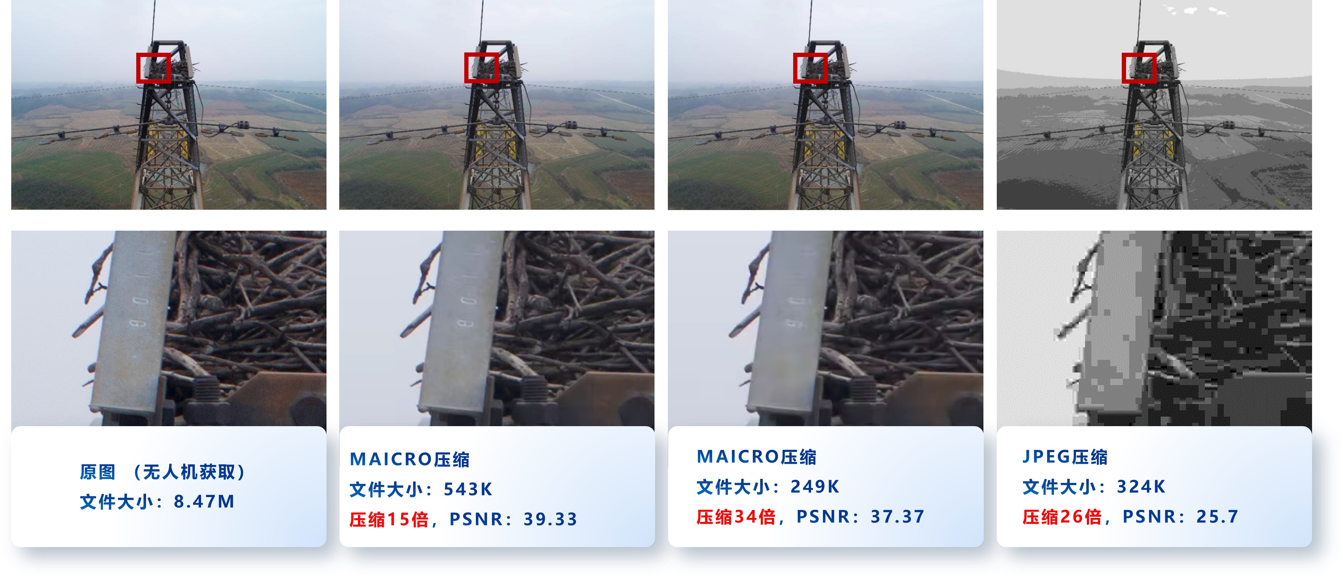 针对因采集图像、视频数据过于庞大、传输缓慢而造成的系统分辨、识别电力设备状态缓慢等问题,中科方寸知微以中国科学院自动化研究所模式识别国家重点实验室、人工智能与先进计算联合实验室等国内顶尖人工智能前沿科学研究机构为依托,深耕于深度学习、图像与视频内容分析、智能芯片架构设计等领域,以软硬件一体互联的方式,研究开发了基于人工智能神经网络轻量化的图像编解码技术。