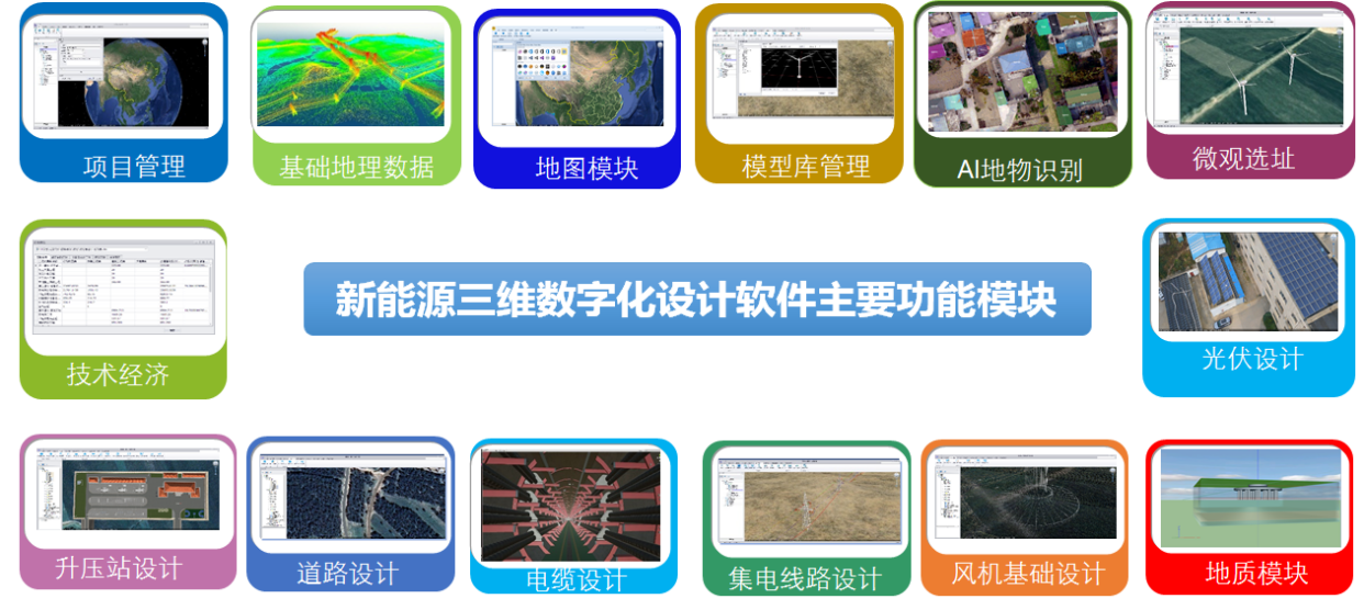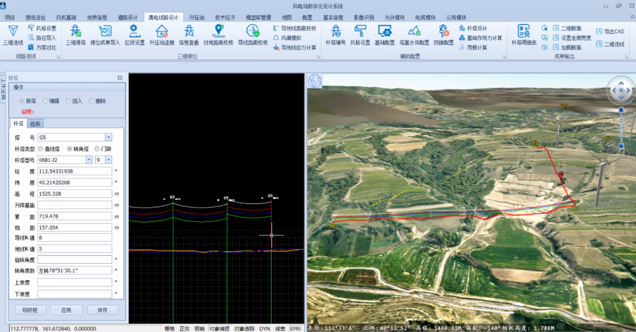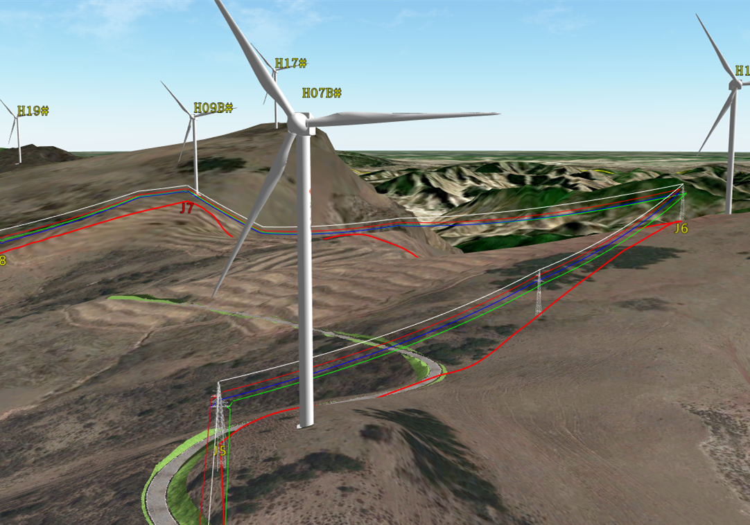 国遥EV-Globe风电三维数字化设计平台基于三维GIS和BIM数据融合,实现了风资源、电气、土建、道路、集电线路等专业协同设计,适用于风电工程可研、初设、施工图等设计阶段,提供基础地理信息管理、设备模型管理、微观选址及发电量测算、风机基础设计、道路设计、集电线路设计(架空以及电缆)、升压站布置、投资计算和经济评价等功能,同时可实现设计成果数字化移交,填补了行业空白,为新能源数字化转型打下了坚实基础。