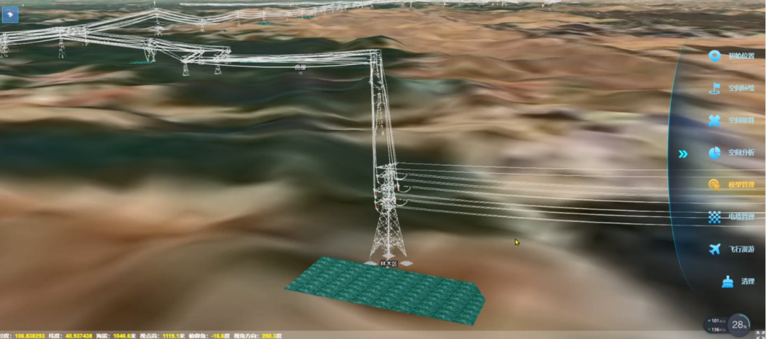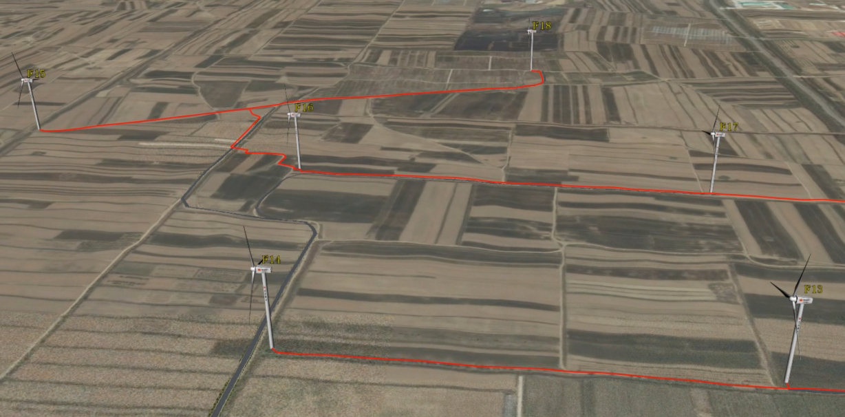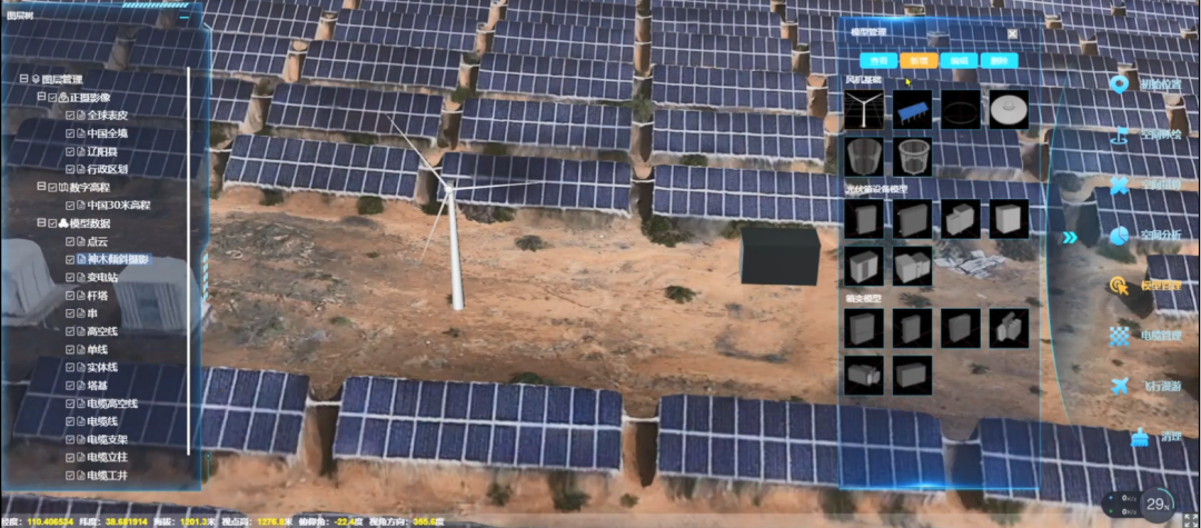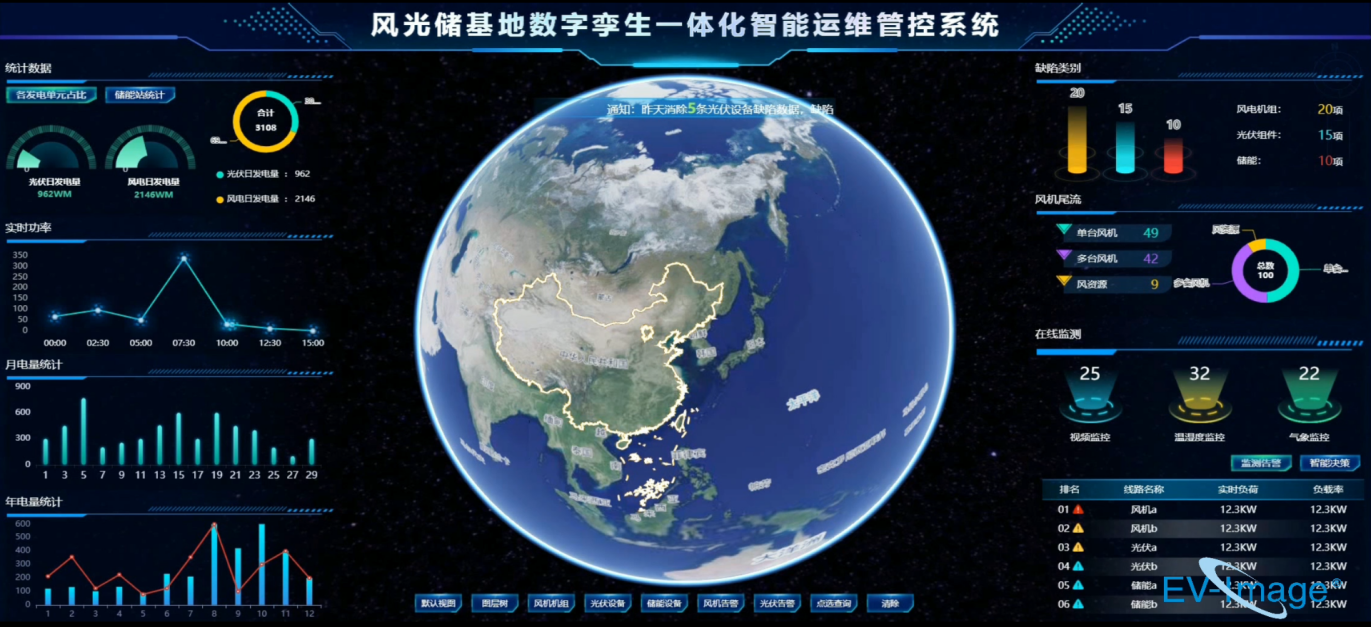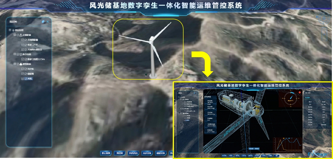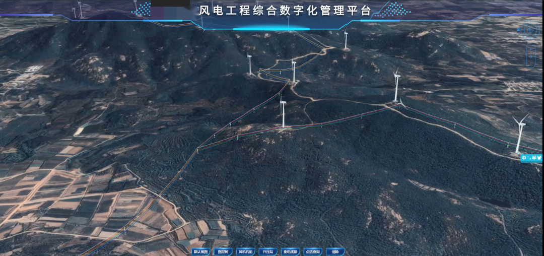 基于智采集(高效智慧遥感采集网)、智聚合(遥感三维大数据聚合)、智应用(遥感智慧应用探索)于一体的智慧遥感服务体系,北京国遥新天地信息技术股份有限公司自主研发了时空遥感大数据三维平台EV-Globe,平台依托数字孪生技术,结合虚拟游戏引擎与云渲染模式,能够在多源地理空间信息基础上,通过大数据挖掘分析,完成数字孪生平台对风电系统各空间数据的统一存储与管理,同时提供4D数据上传、加载等服务,对风电空间信息进行建模、仿真、演绎和操控,开展三维电力设施精细化展示。