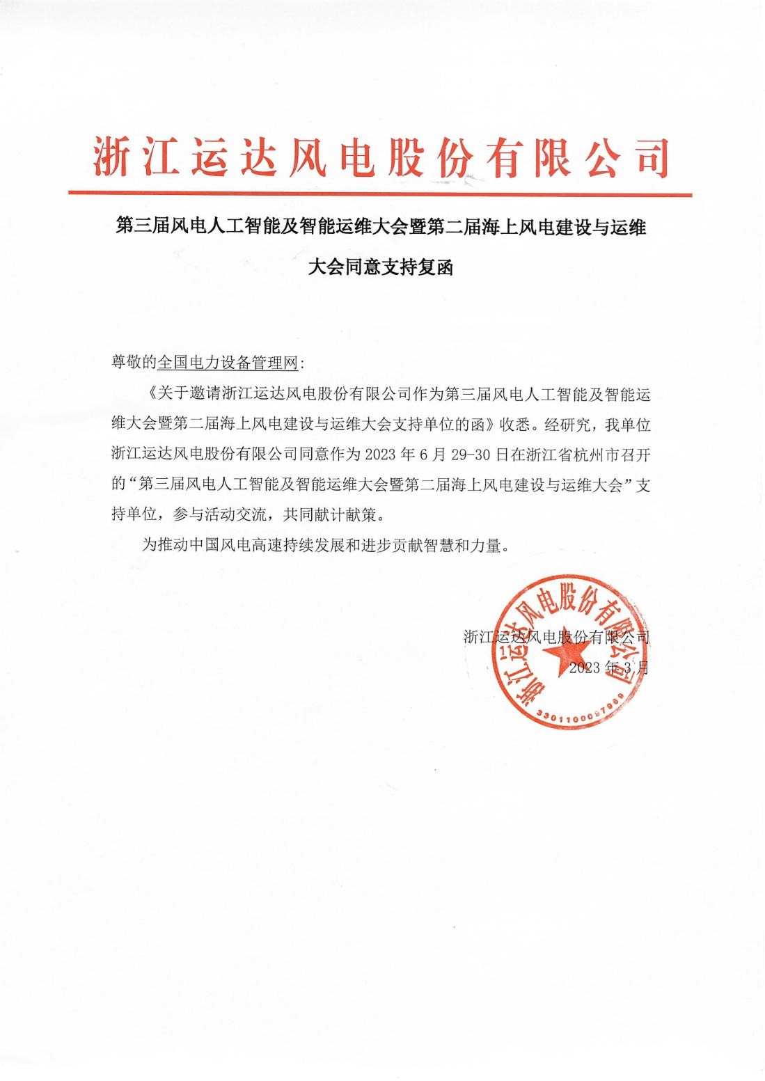 浙江运达风电股份有限公司作为支持单位出席2023年6月29-30日在杭州召开的2023年第三届风电人工智能大会及智能运维大会暨第二届海上风电建设与运维大会。