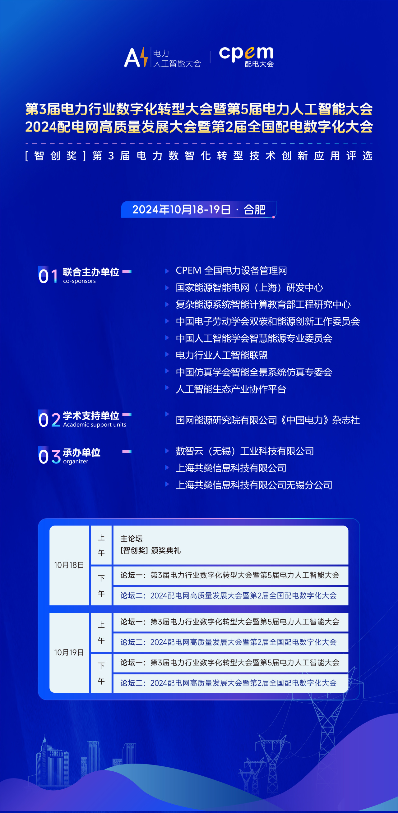 2024年10月18-19日,“第3届电力行业数字化转型大会暨第5届电力人工智能大会”、“2024配电网高质量发展大会暨第2届全国配电数字化大会”将在安徽省合肥市盛大召开!