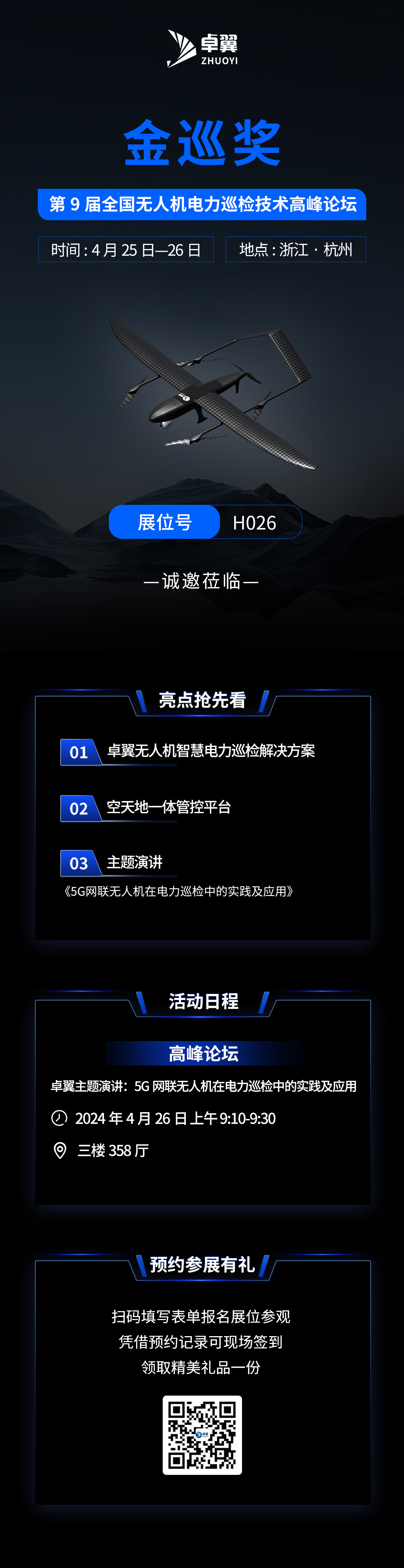 展会期间,卓翼技术总监将于4月26日上午9:10-9:30,在展会三楼358厅带来高峰论坛主题演讲:5G网联无人机在电力巡检中的实践及应用。卓翼诚挚邀请您莅临展位H026参观指导,与工程师面对面交流相关技术及解决方案,共话无人机电力智能巡检新技术,开辟未来发展新篇章。