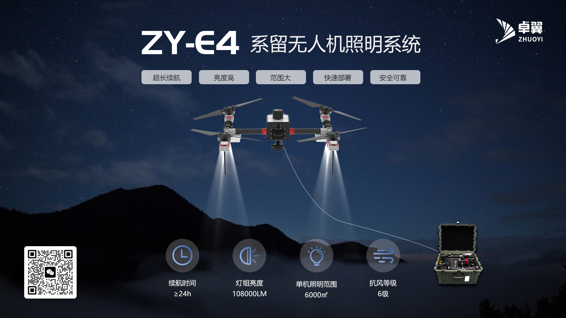 卓翼智能-ZY-E4是一款适用于夜间野外复杂环境下应急救援和各类作业的系留无人机照明系统。广泛应用于应急、电力、公安、市政交通、建筑石油石化、河流水利、军工等领域。