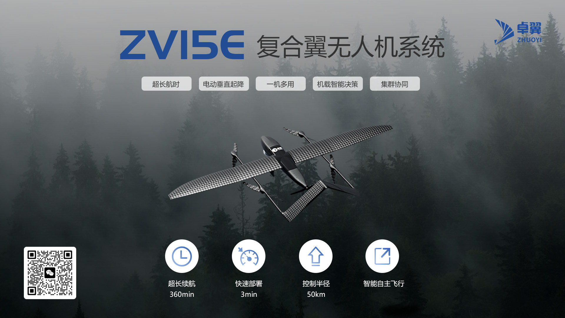 ZV15E复合翼无人机,具有超长航时、电动垂直起降、一机多用、机载智能决策与集群协同的特点。广泛应用于应急救援、森林消防、地理测绘、警用安防等各种起降环境复杂,任务需求多样的应用场景。