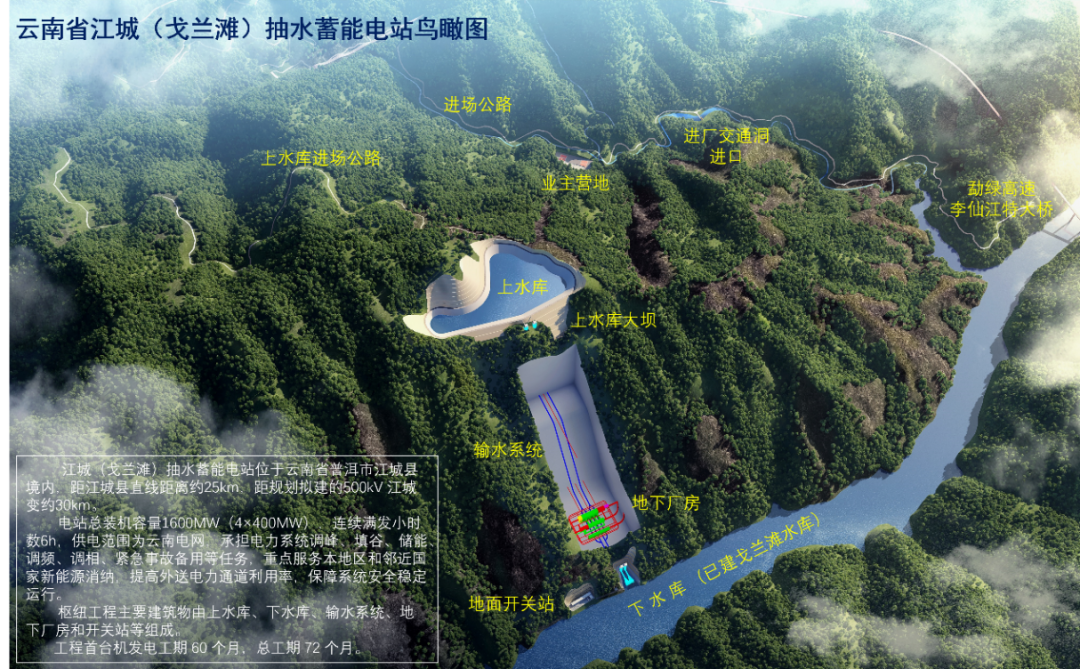 戈兰滩抽水蓄能电站,位于云南省普洱市江城县境内,总装机容量1600MW,额定水头745m,距高比2.0,工程静态总投资约81.3亿元。