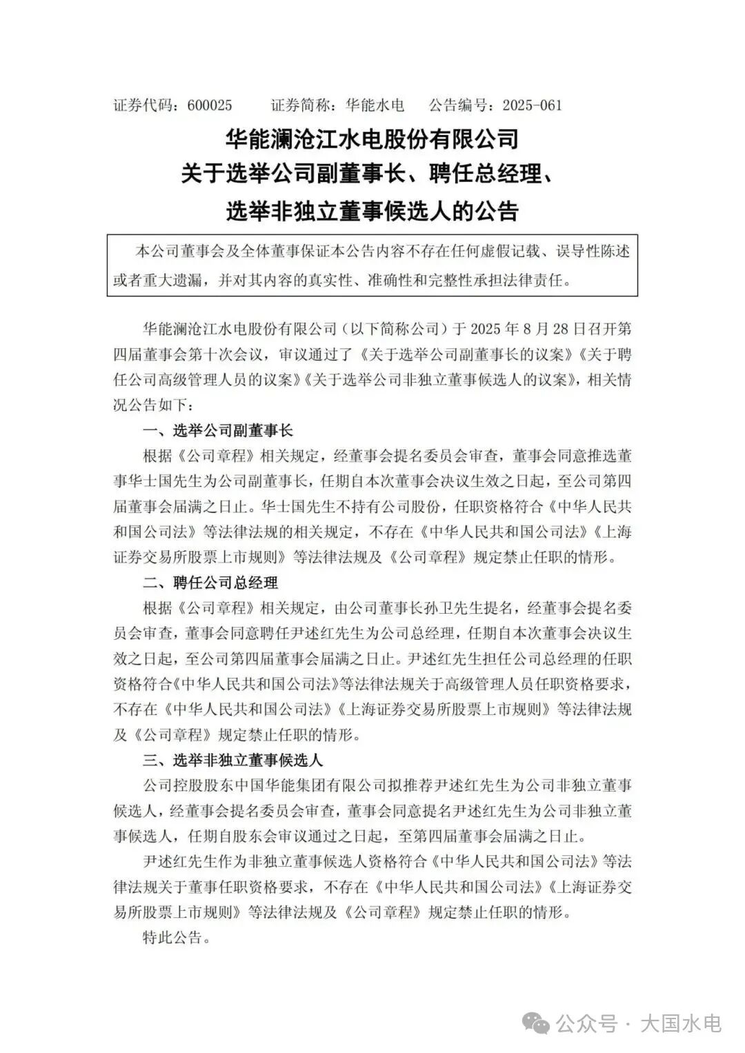 8月28日,华能澜沧江水电股份有限公司(以下简称“华能水电”)公告称,华能水电于8月28日召开第四届董事会第十次会议,审议通过了《关于选举公司副董事长的议案》《关于聘任公司高级管理人员的议案》《关于选举公司非独立董事候选人的议案》。