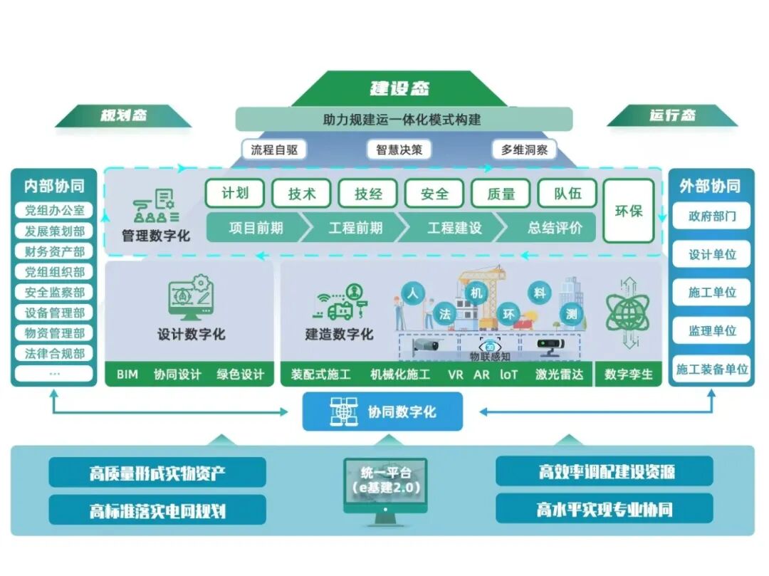 e基建2.0是立足基建专业过程性、基础性、移动性、外部性等特征,打造的统一数字化平台。以数据要素和数字技术为驱动,围绕管理、设计、建造、协同四个方向转型升级,主要构建以“六精”为主要内涵的专业管理体系,实现基建各项目、各环节、各专业线上管控,推进以“四化”为基本特征的高质量建设业务支撑,解决基建业务线上管控、现场减负增效等实际业务问题,助力“规建运”一体化电网建设模式构建。