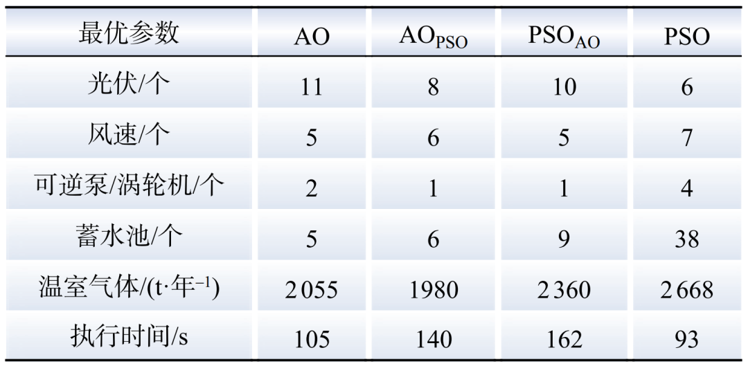 为了实现最小化LCOE,通过求解优化问题来确定混合微电网组件的最佳容量。选择相同的步长及容量,对本文所提出的算法进行验证。比较了4种优化方法的最优参数如表1所示。根据表1中决策变量的不同,可以发现混合优化方法在执行时间和成本方面比单独使用任一算法更快地接近最优解。