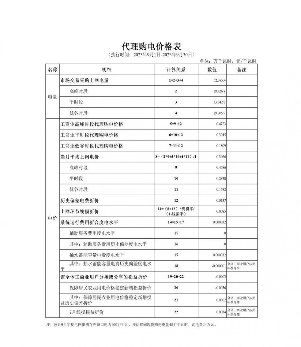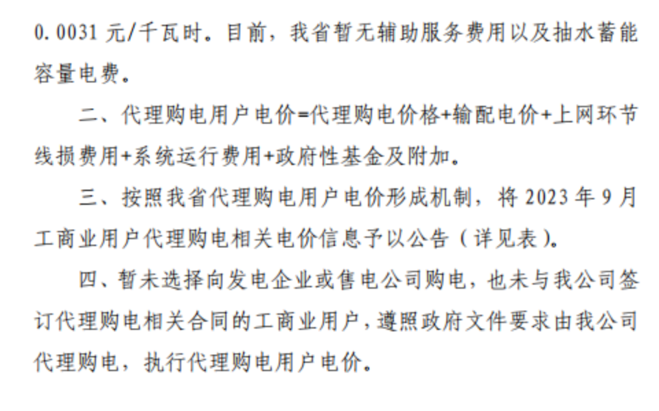 以下为2023年9月各地电网企业代理购电价文件信息。先后顺序为:北京、天津、上海、重庆、河北、冀北、黑龙江、吉林、辽宁、蒙东、内蒙古、甘肃、宁夏、青海、贵州、云南、新疆、山西、山东、陕西、安徽、河南、江苏、浙江、湖北、湖南、四川、江西、广东、深圳、广西、福建、海南。