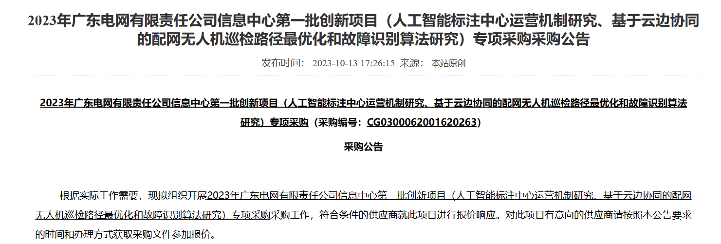 1.项目名称:2023年广东电网有限责任公司信息中心第一批创新项目(人工智能标注中心运营机制研究、基于云边协同的配网无人机巡检路径最优化和故障识别算法研究)专项采购
