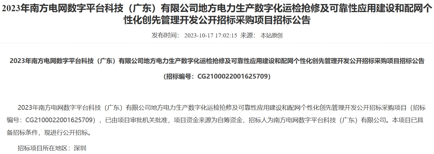 (一)项目名称:2023年南方电网数字平台科技(广东)有限公司地方电力生产数字化运检抢修及可靠性应用建设和配网个性化创先管理开发公开招标采购项目