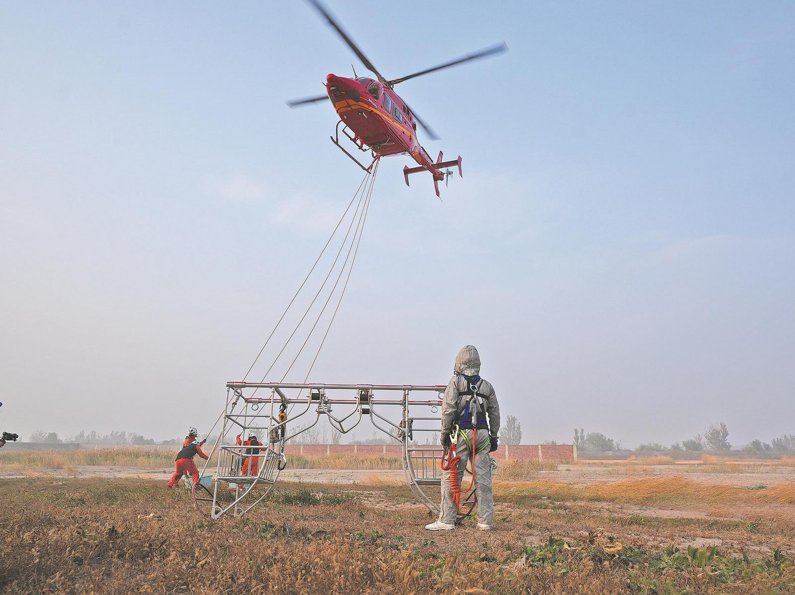 “天气状况良好,吊篮连接牢靠,工具准备完毕,可以起飞!”10月31日,在天津市静海区沿庄镇的±800千伏特高压鲁固线一基铁塔处,国网天津高压公司作业人员采用直升机进电位法开展带电作业,消除了导线引流板过热缺陷。
