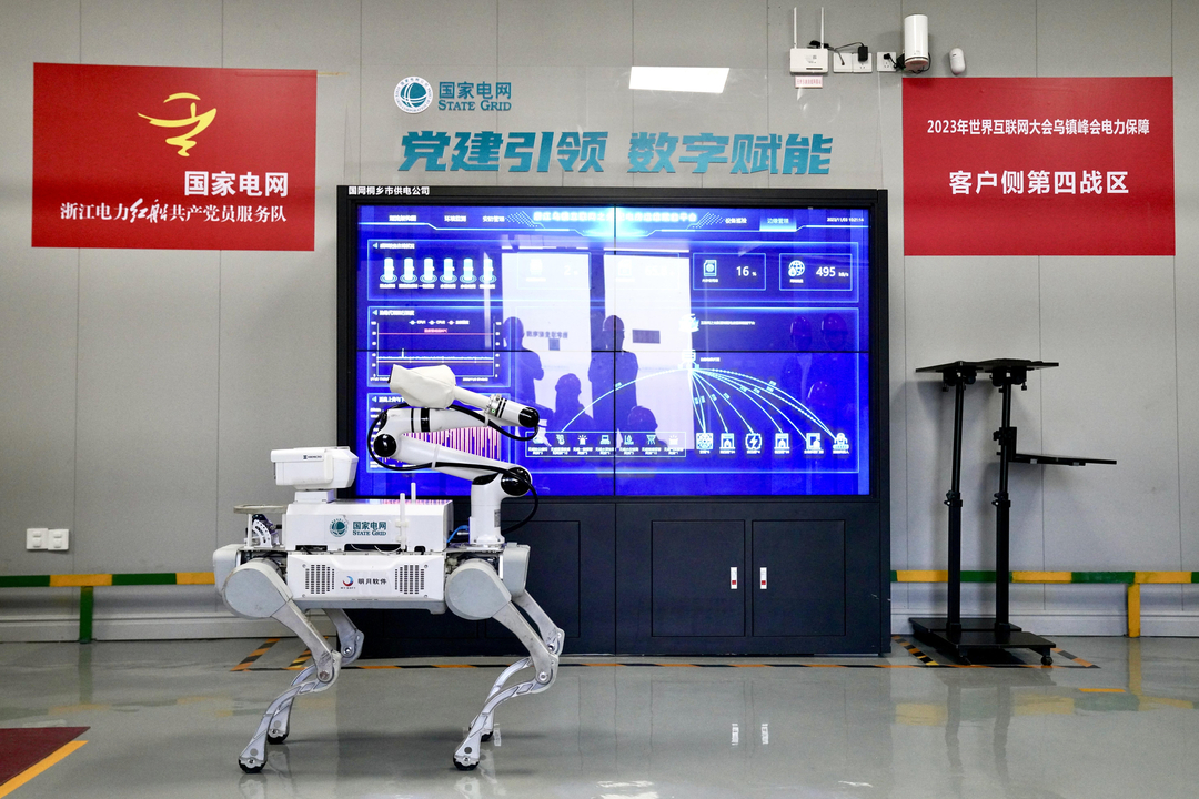 近日,2023年世界互联网大会“互联网之光”博览会在浙江乌镇开幕。在数字新基建展馆,国网桐乡市供电公司工作人员曹鑫向潮新闻记者介绍,机器狗能够进入地下的电缆隧道,也能在变电站、配电房等场景下大显身手,“代替原来人工做的一些巡视和检查的作业。”
