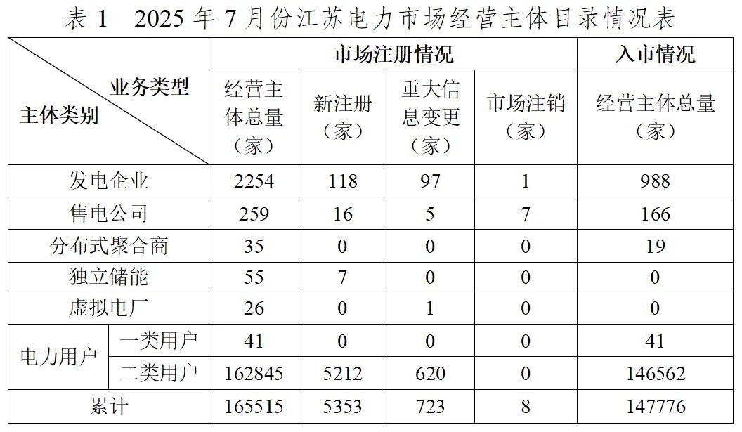 截至2025年7月31日,江苏电力市场经营主体共计165515家,其中发电企业2254家,售电公司259家,分布式聚合商35家,独立储能企业55家,虚拟电厂26家,电力用户162886家(一类用户41家,二类用户162845家)。