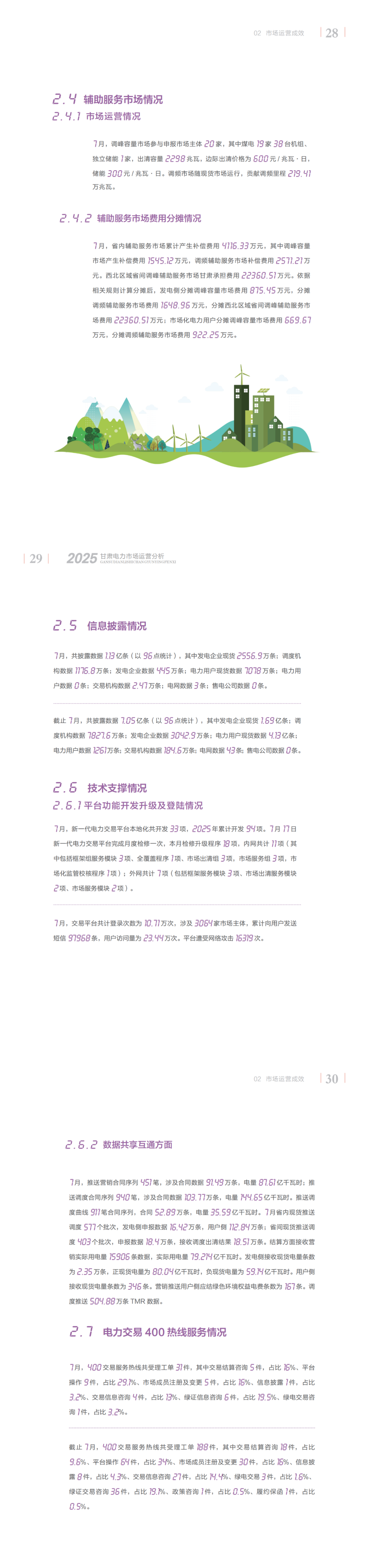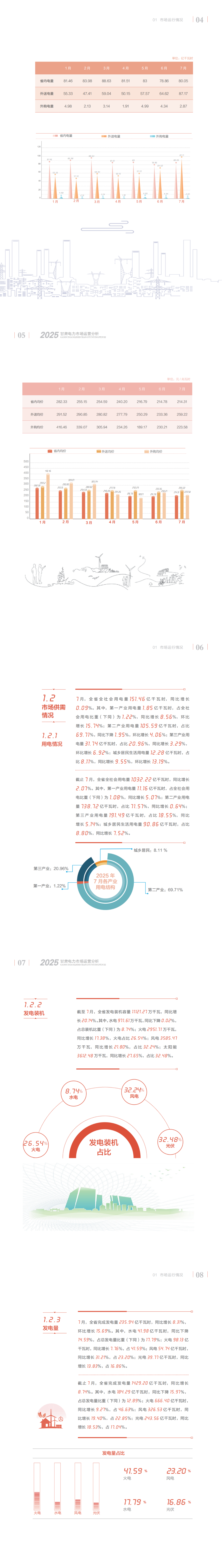 甘肃电力交易中心发布甘肃电力市场运营报告(2025年7月),报告显示,7月,甘肃电力市场运行总体平稳,市场化交易方面:省内中长期电量小下降,外送电量增幅较大,同比上涨28个百分点。市场需求方面:省内用电保持平稳,第一产业城乡居民用电小幅增长。发电装机及发电量方面::截止了月底,装机规保持快速长主要集中在光伏,同比增幅达 27.55%;新能源发电量占比40.05%。