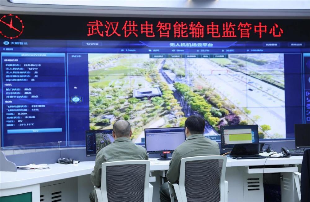10月23日,武汉汉口江滩,一架白色的无人机在高空穿梭,机头对准滨江区内的国家电网线路来回进行扫描、拍摄。与此同时,距离巡检现场数公里外的国网武汉供电公司的巨型屏幕上,无人机的超高清画面即时显示。